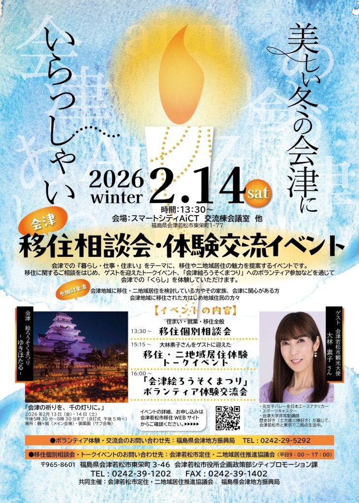 移住・二地域居住の相談会はもちろん、ゲストによるトークイベントや会津の冬のイベント「絵ろうそくまつり」でのボランティア体験など会津の「くらし」を知って、体験できるイベントです。